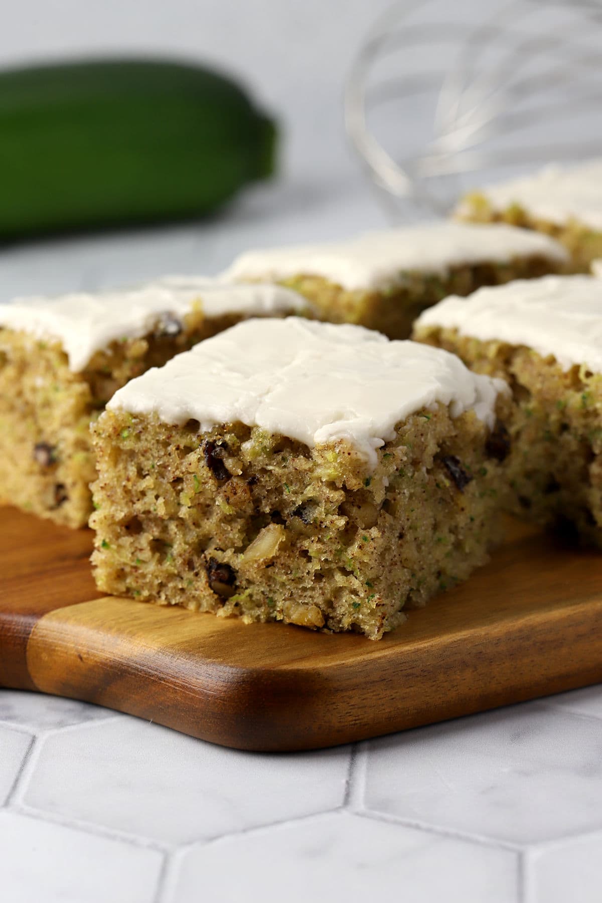 Flavor/texture: Tender, cakey bars filled with crunchy walnuts (similar to a classic zucchini bread) topped with a thin layer of vanilla icing.